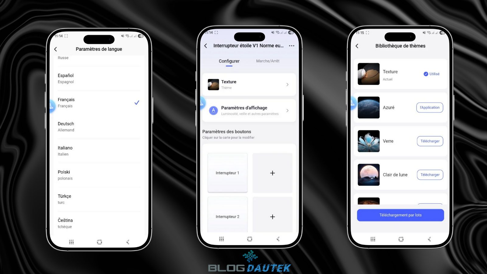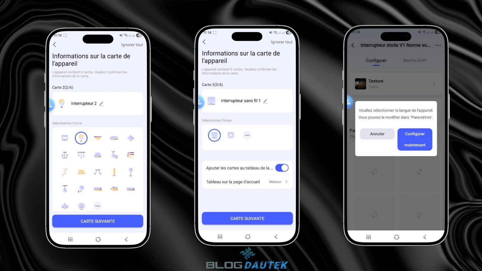 Puis, sur les 4 cartes des interrupteurs virtuels. Configurez la langue en sélectionnant le français.