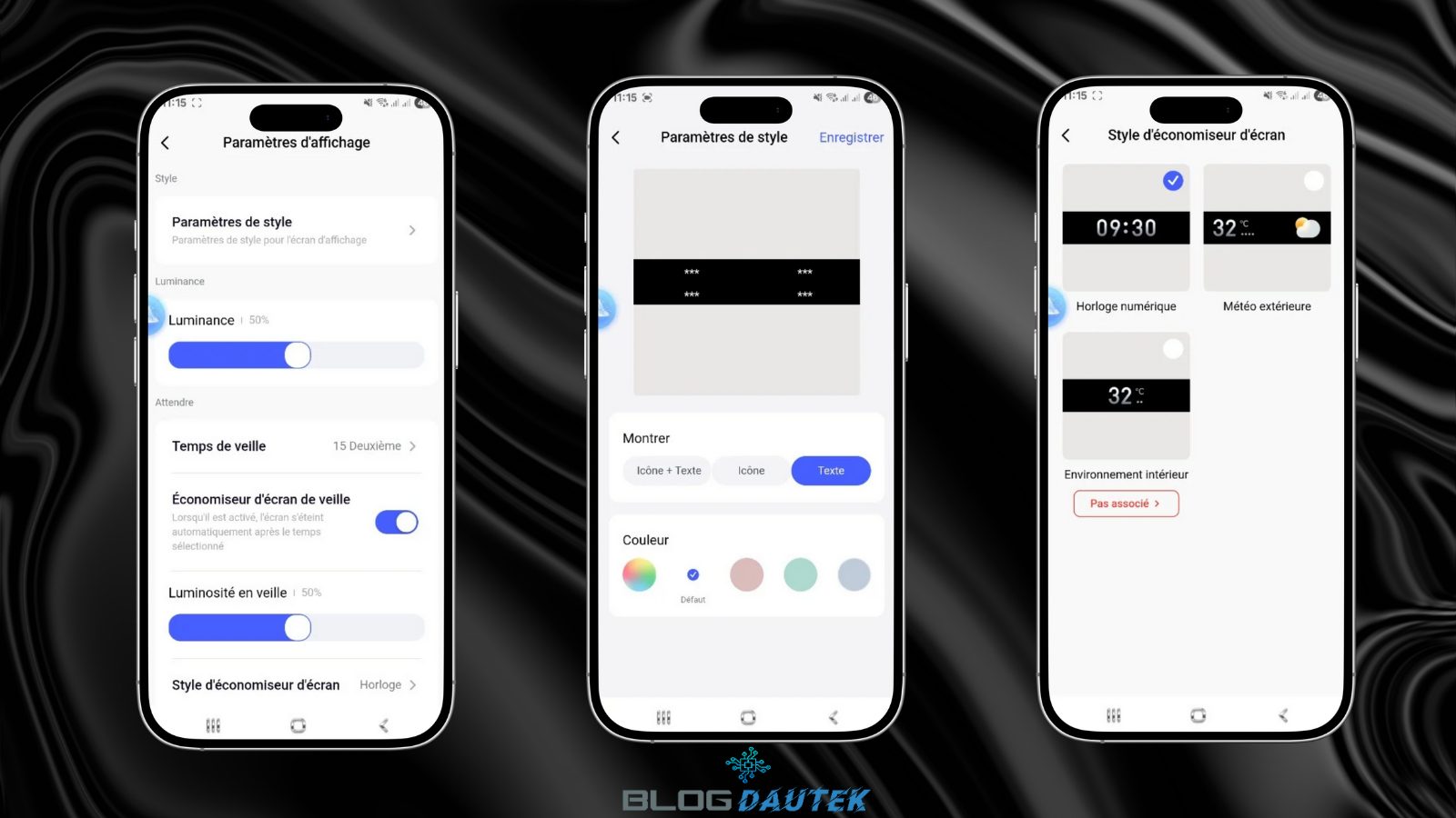 Maintenant, allons dans les paramètres d’affichage, avec les paramètres de style pour la mise en forme voulu ou encore les économiseurs d’écran en fonctions de vos envies. On peut voir l’économiseur d’écran sur horloge numérique sur l’écran de l’interrupteur.