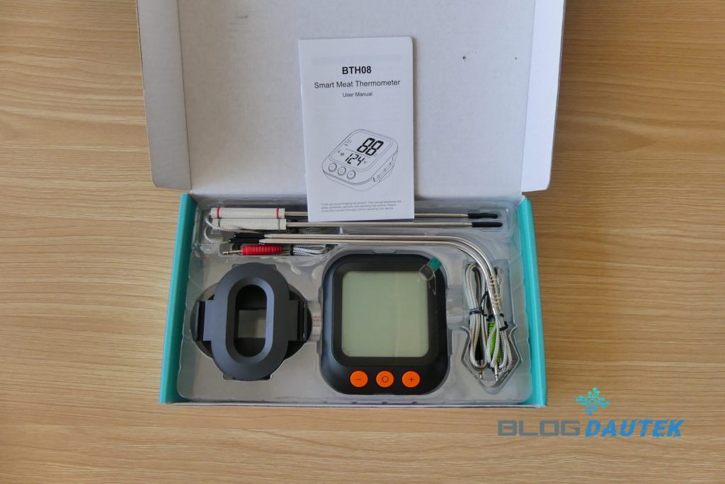 Le thermomètre à viande est fourni avec une notice, 4 sondes (2 droites et 2 coudés), 2 supports de stockage de sonde et un clip de fixation sur la grille de barbecue.