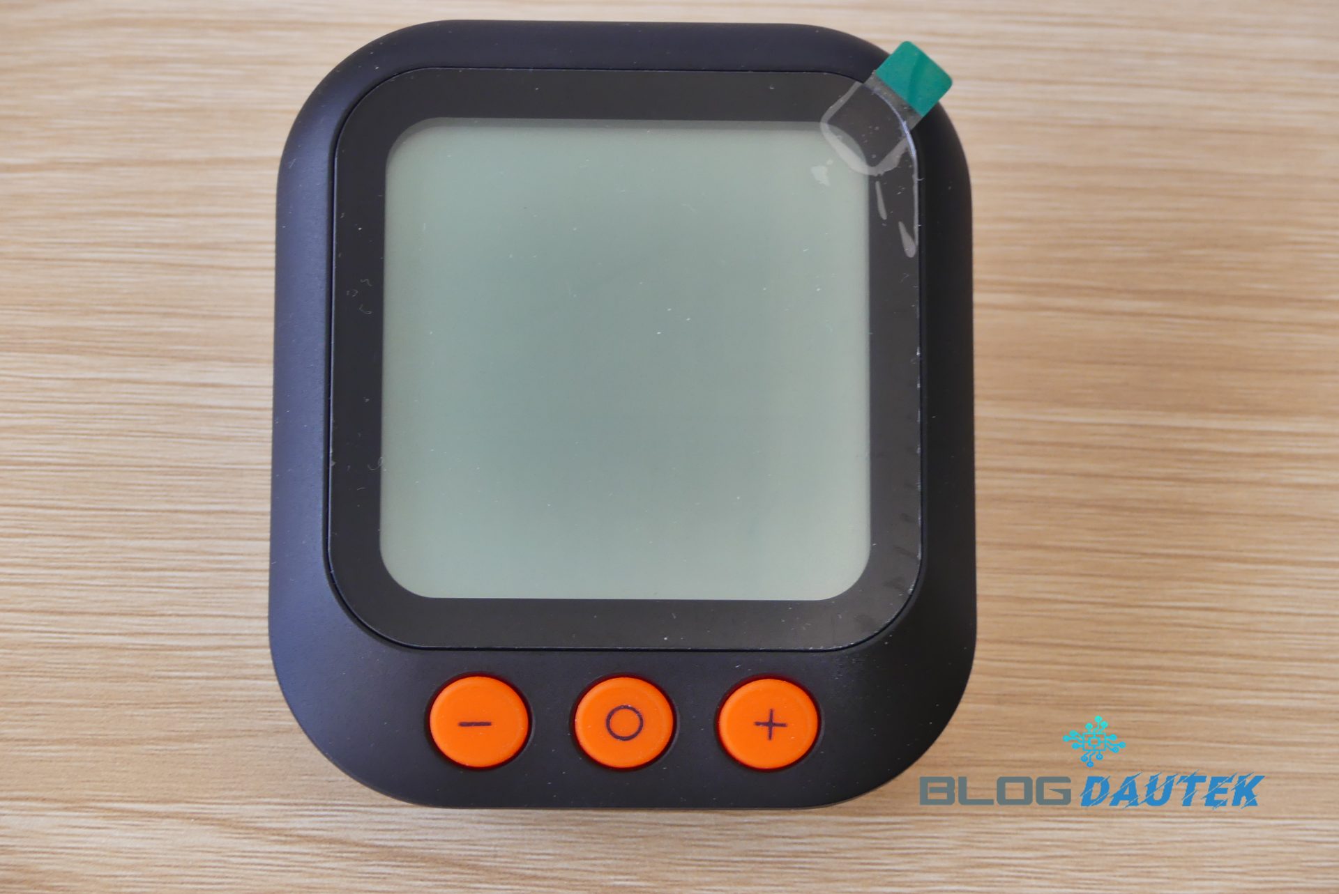 Vue de face, avec l’écran et les boutons pour augmenter ou diminuer la température et au milieu le bouton pour allumer et éteindre le thermomètre et sélection des sondes.
