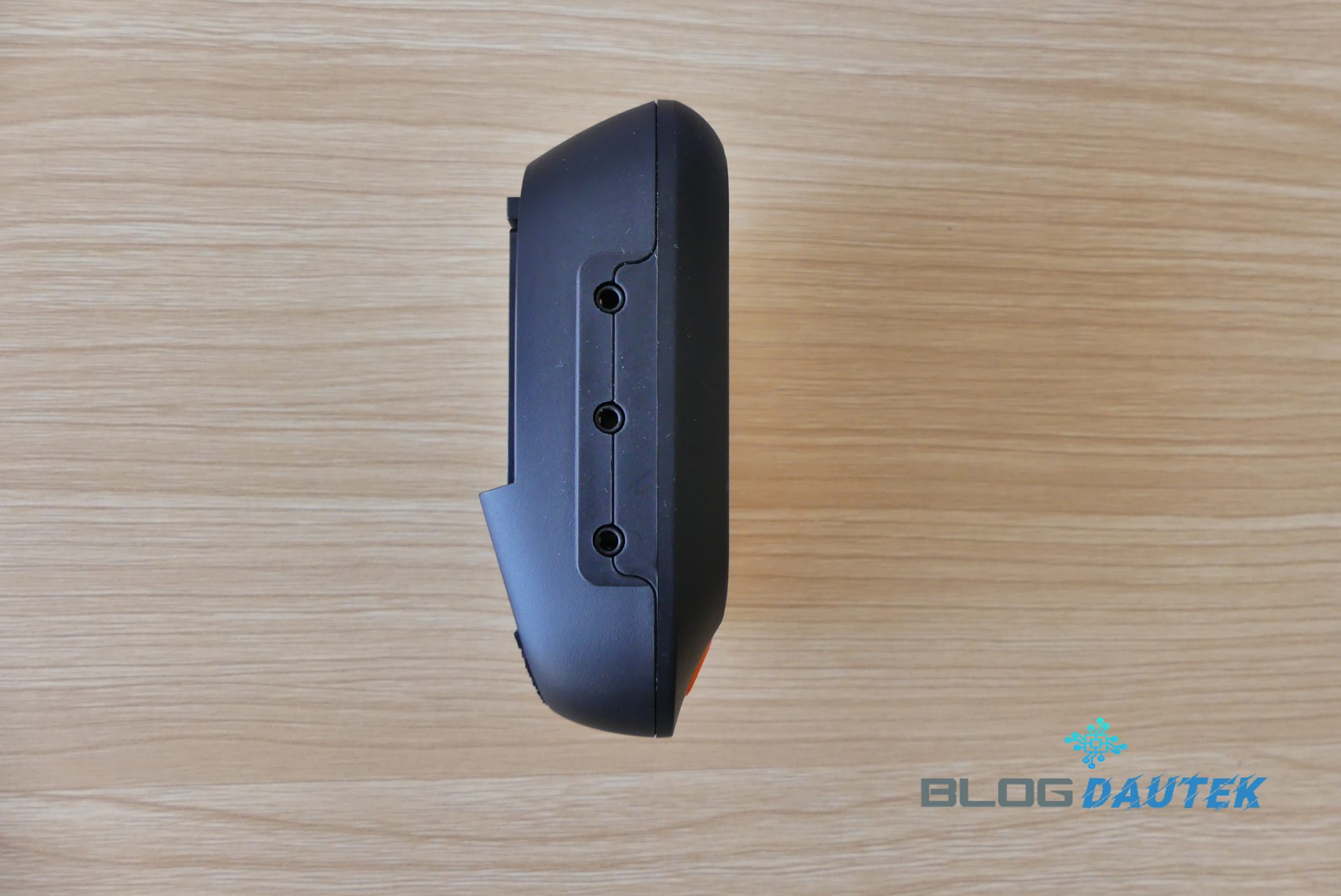 De dos, avec des patins antidérapants et l’emplacement des piles.