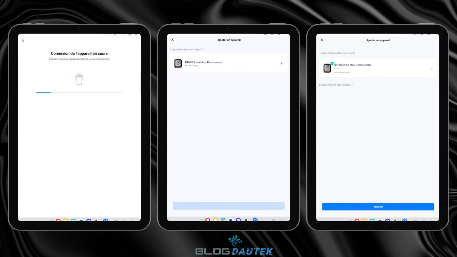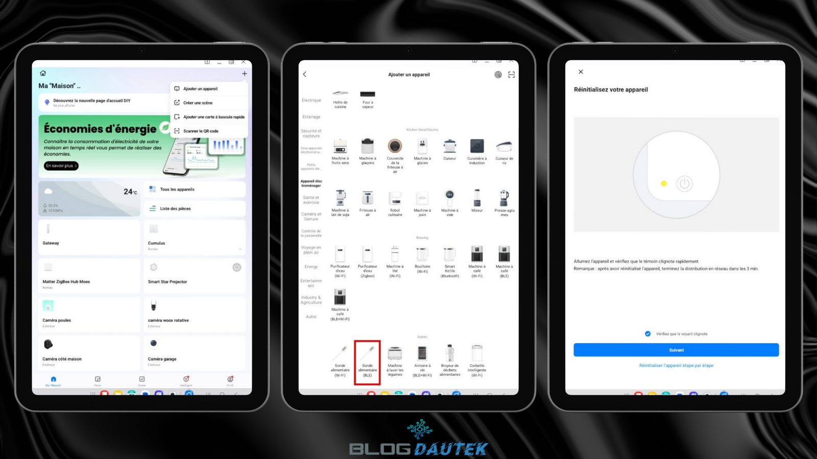 Vous pouvez faire l’intégration sur l’application Smartlife / Tuya, cliquez sur le + en haut à droite et cliquez sur Ajouter un nouvel appareil. Ensuite, cliquez sur Sonde alimentaire (BLE) et lancez l’appairage en appuyant sur – et + pendant 3 secondes. Sélectionnez la case et cliquez sur Suivant.