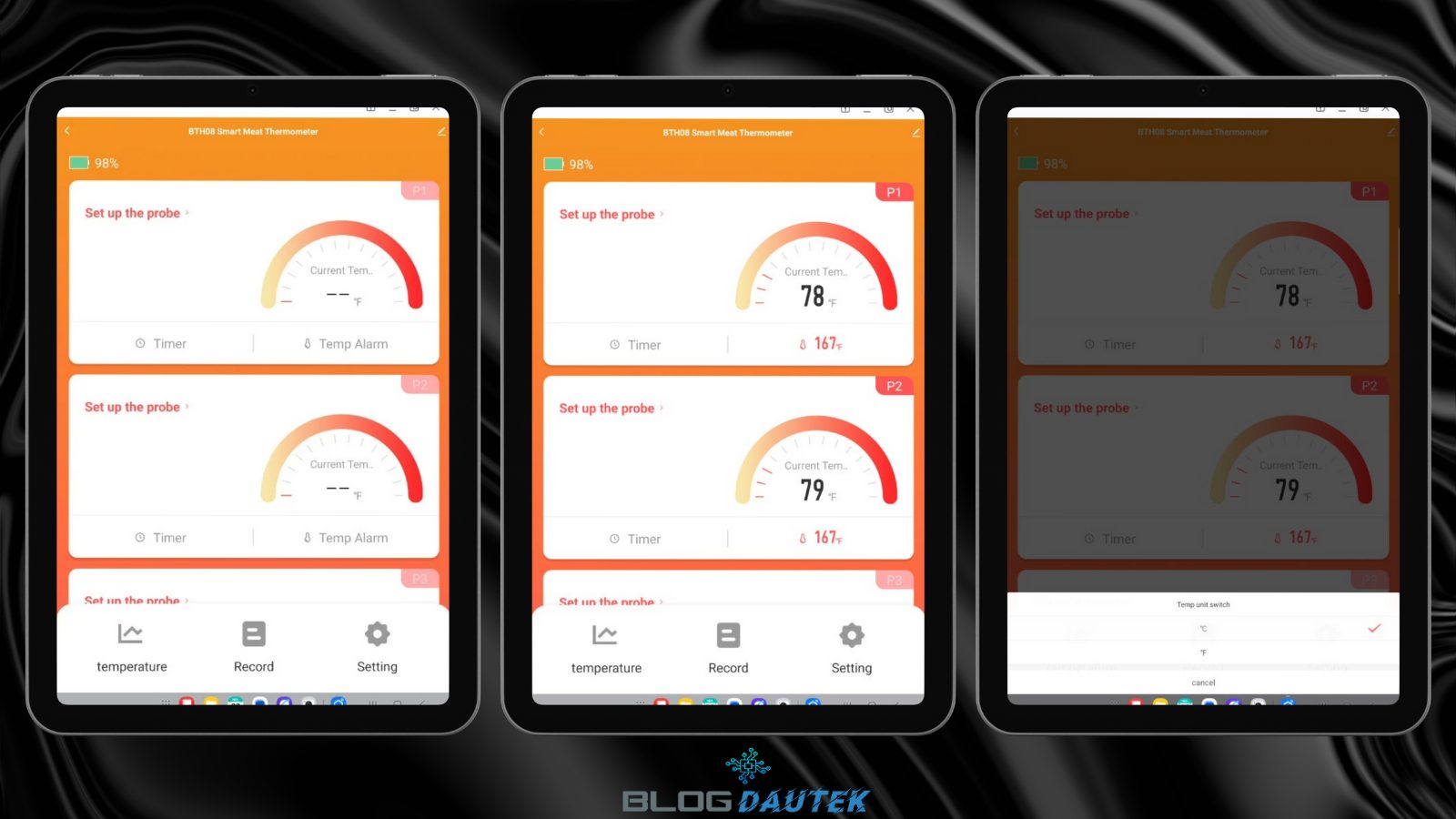 Ensuite, nous sommes sur la page du thermomètre avec les 6 sondes possibles, branchez des sondes et on voit que la température est en Fahrenheit. Pour changer, cliquez sur Setting et cliquez sur C pour Celsius.