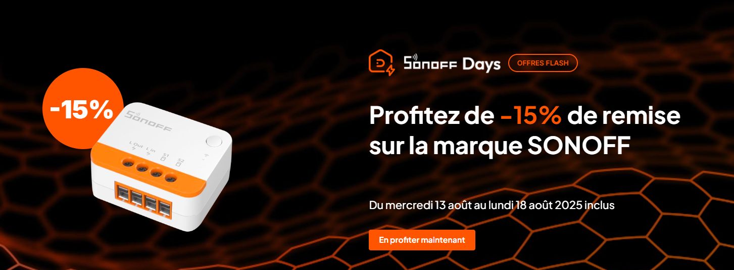 Du 13 au 18 Août 2025, Domadoo organise les incontournables Sonoff Days : presque une semaine intense de promotions dédiées à la domotique et à la maison connectée ! Les produits Sonoff bénéficient de -15% de réduction, ce qui en fait le moment parfait pour étoffer son installation domotique à moindre coût.