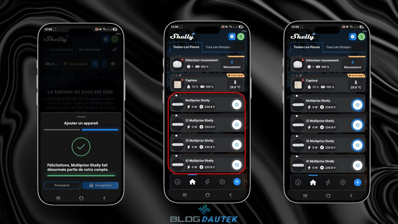 Pour l’intégrer sur l’application Shelly, il suffit de l’ouvrir et la multiprise connectée est directement trouvée. Cliquez sur Ajouter le dispositif deux fois.