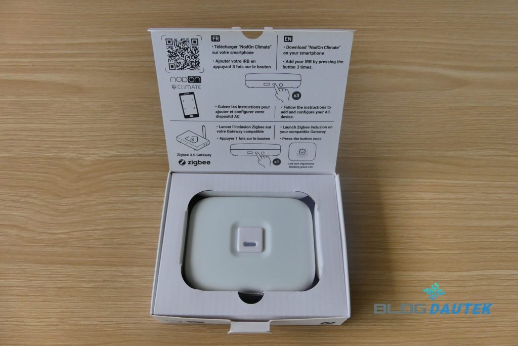 La télécommande infrarouge est fournie avec la notice intégrée sur l’emballage. Pas d’alimentation fourni, il faut, soit un bloc secteur et un câble USB-C, soit l’alimentation vendue par Nodon mais séparément.