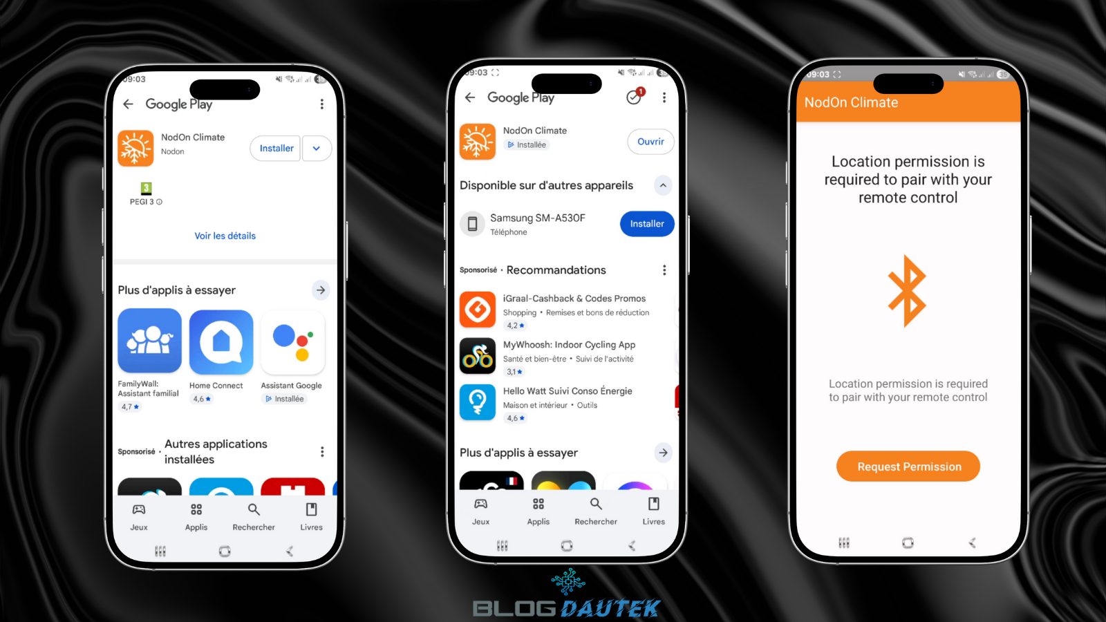 Pour l’intégrer, je vais installer l’application créée pour le contrôleur infrarouge, Nodon Climate. Téléchargez l’application et installez là puis ouvrez là. Donnez les autorisations en cliquant sur Request Permisssion.