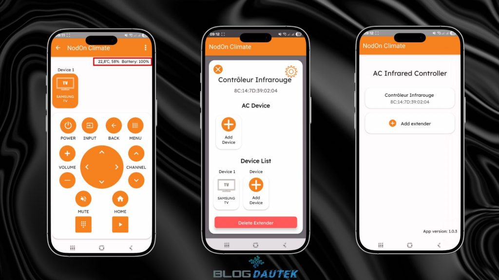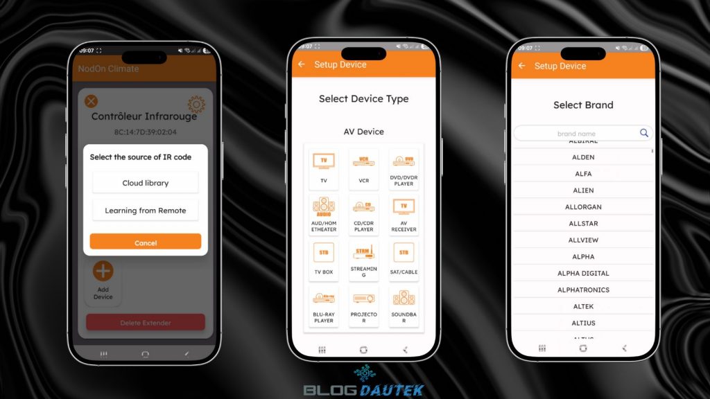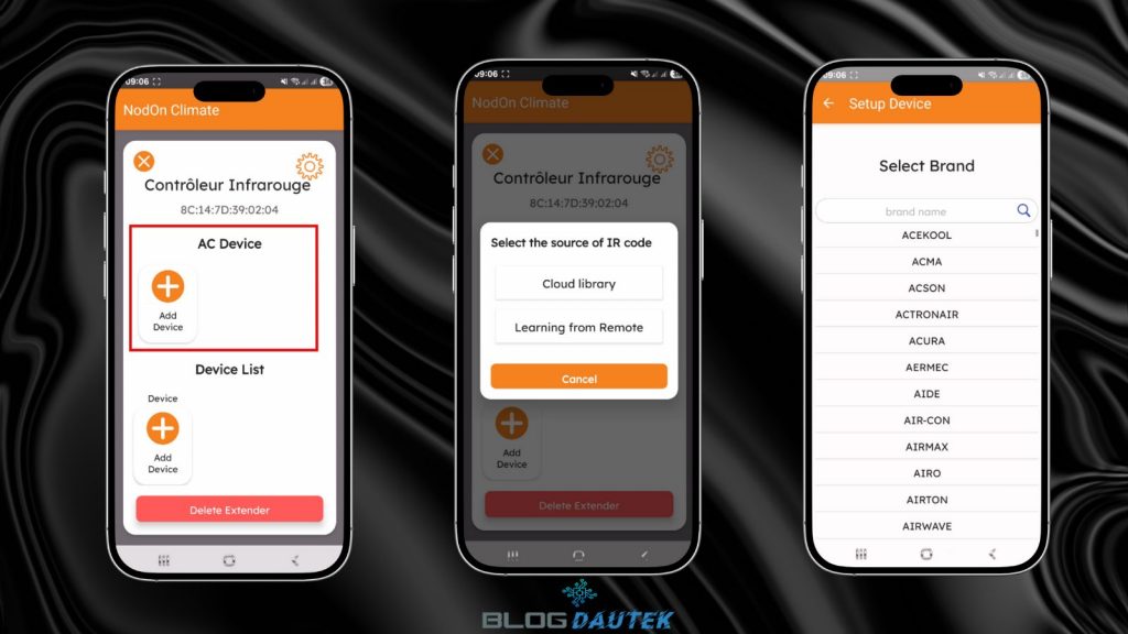 Cliquez sur I have the original remote si vous avez la télécommande d’origine pour faire la configuration avec elle, sinon cliquez sur I don’t have the original remote pour trouver un mode qui correspond en essayant plusieurs codes en essayant d’allumer ou éteindre la climatisation. Dès que un code fonctionne, cliquez sur le bouton orange pour télécharger le code. N’ayant pas de climatisation je ne peux pas aller plus loin, par contre on peut piloter d’autres appareils. Cliquez sur le + de Device List.