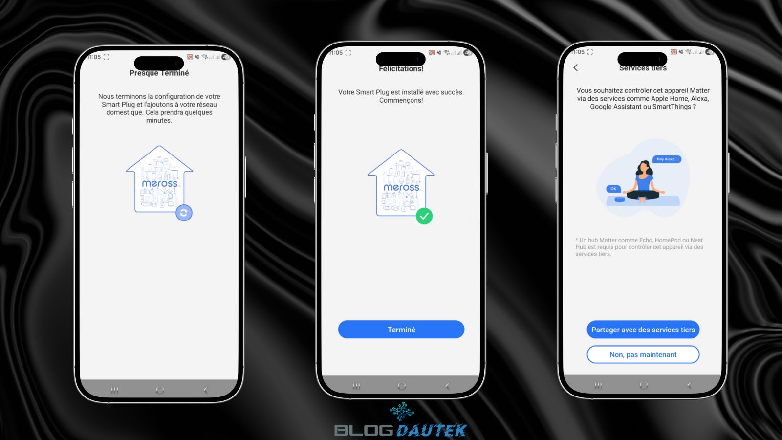 Maintenant, cliquez sur Ensuite et intégrez la prise soit via un assistant vocale soit directement sur Meross, comme moi. Scannez le QR code Matter.