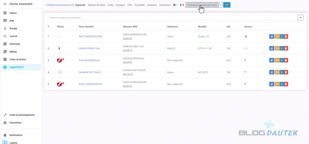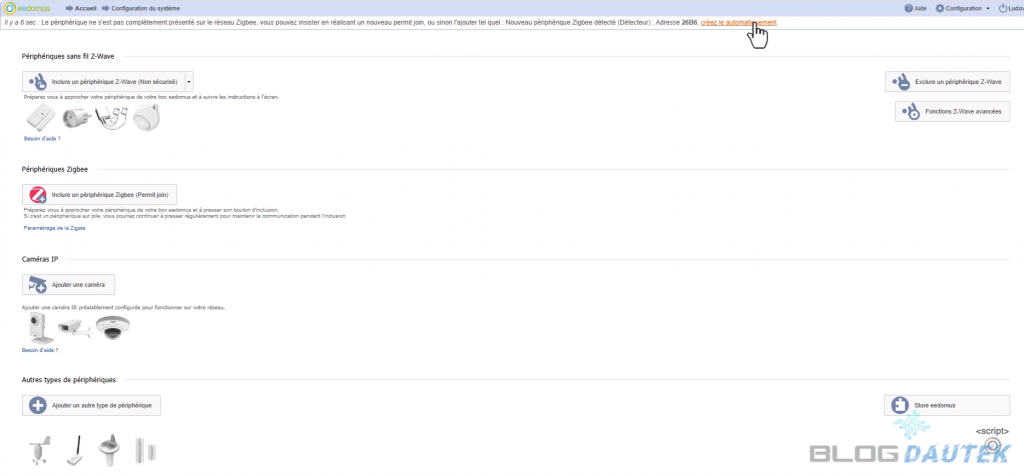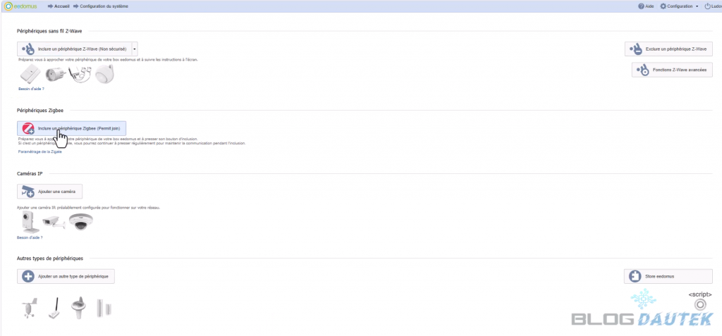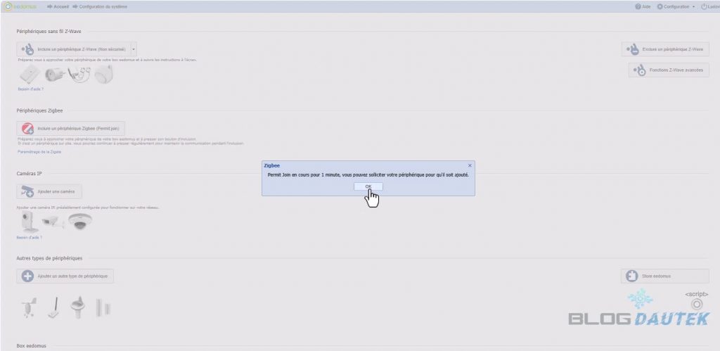 Configuration → Ajouter ou supprimer un périphérique → Inclure un périphérique Zigbee → Cliquez sur OK