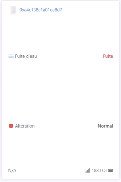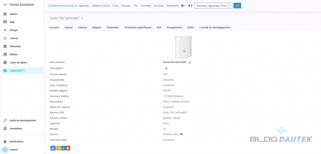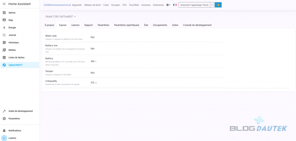 Le détecteur d’inondation est intégré à Home Assistant et en cliquant dessus vous avez les détails. Vous pouvez également accéder à l’onglet Expose pour voir les informations.