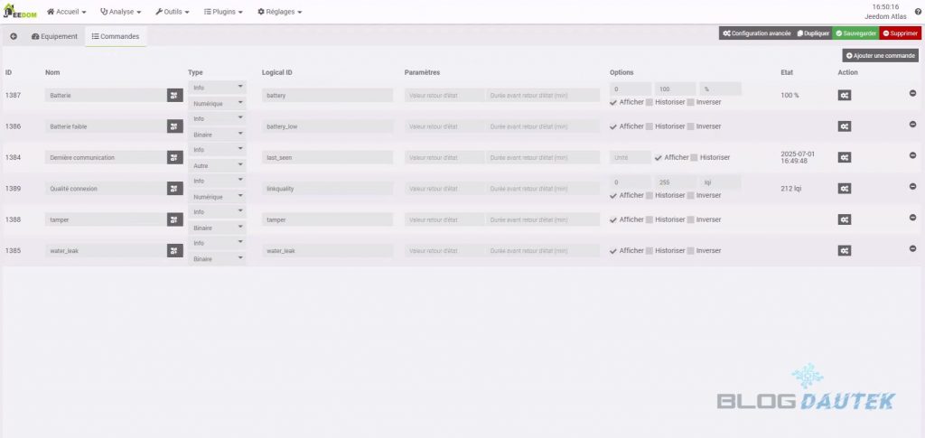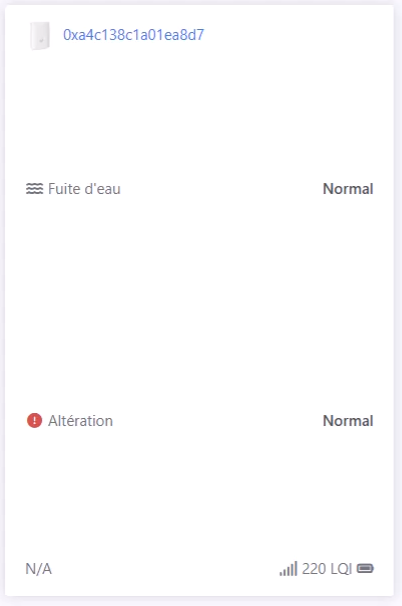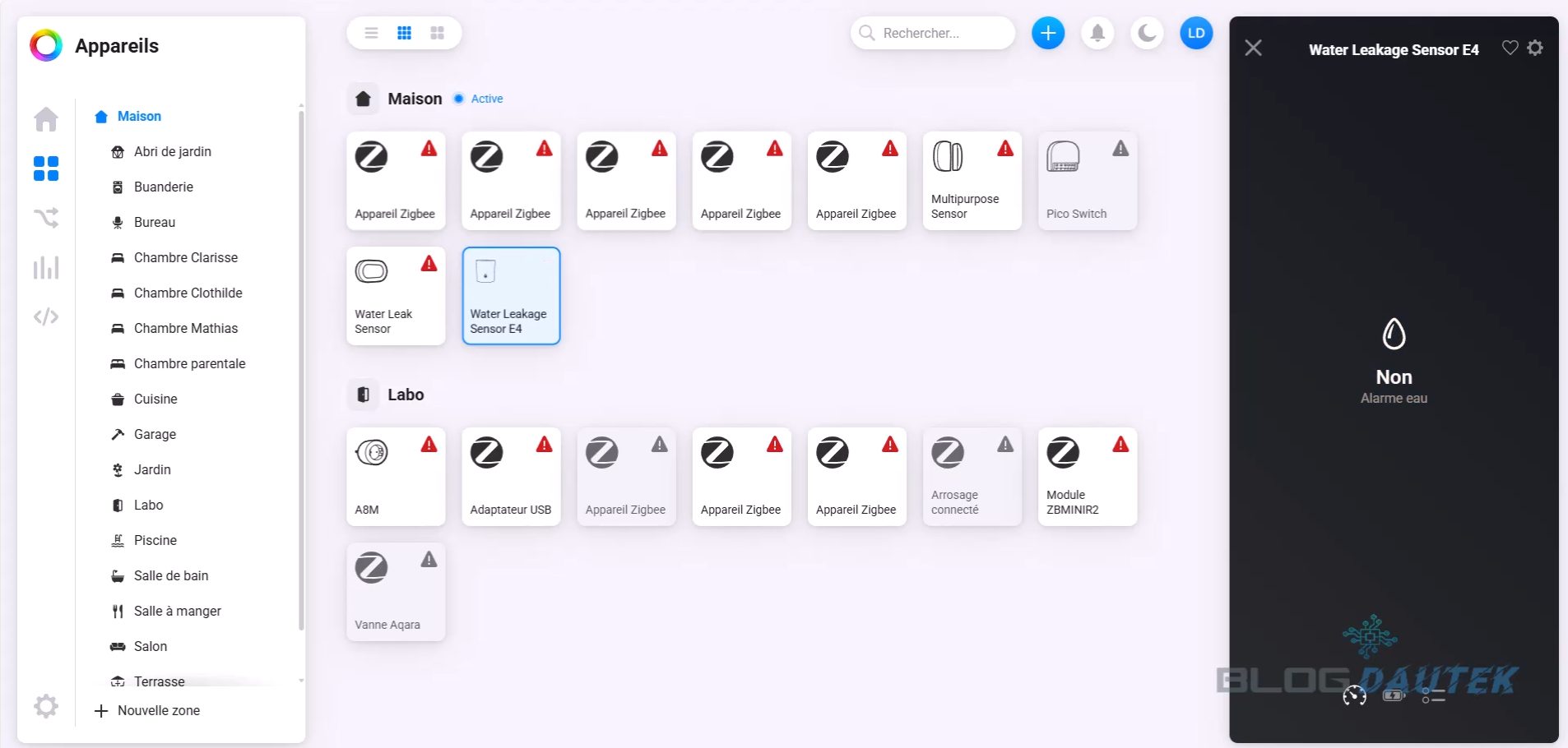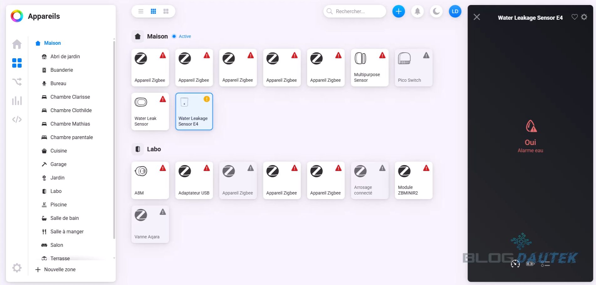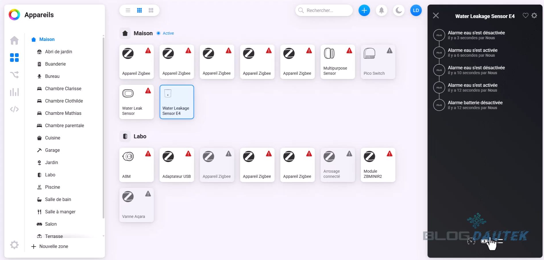 Allez dans Appareils, et vous voyez le détecteur d’inondation avec l’alarme mais aussi en cliquant sur les onglets en bas on peut voir l’état de la batterie et l’historique.