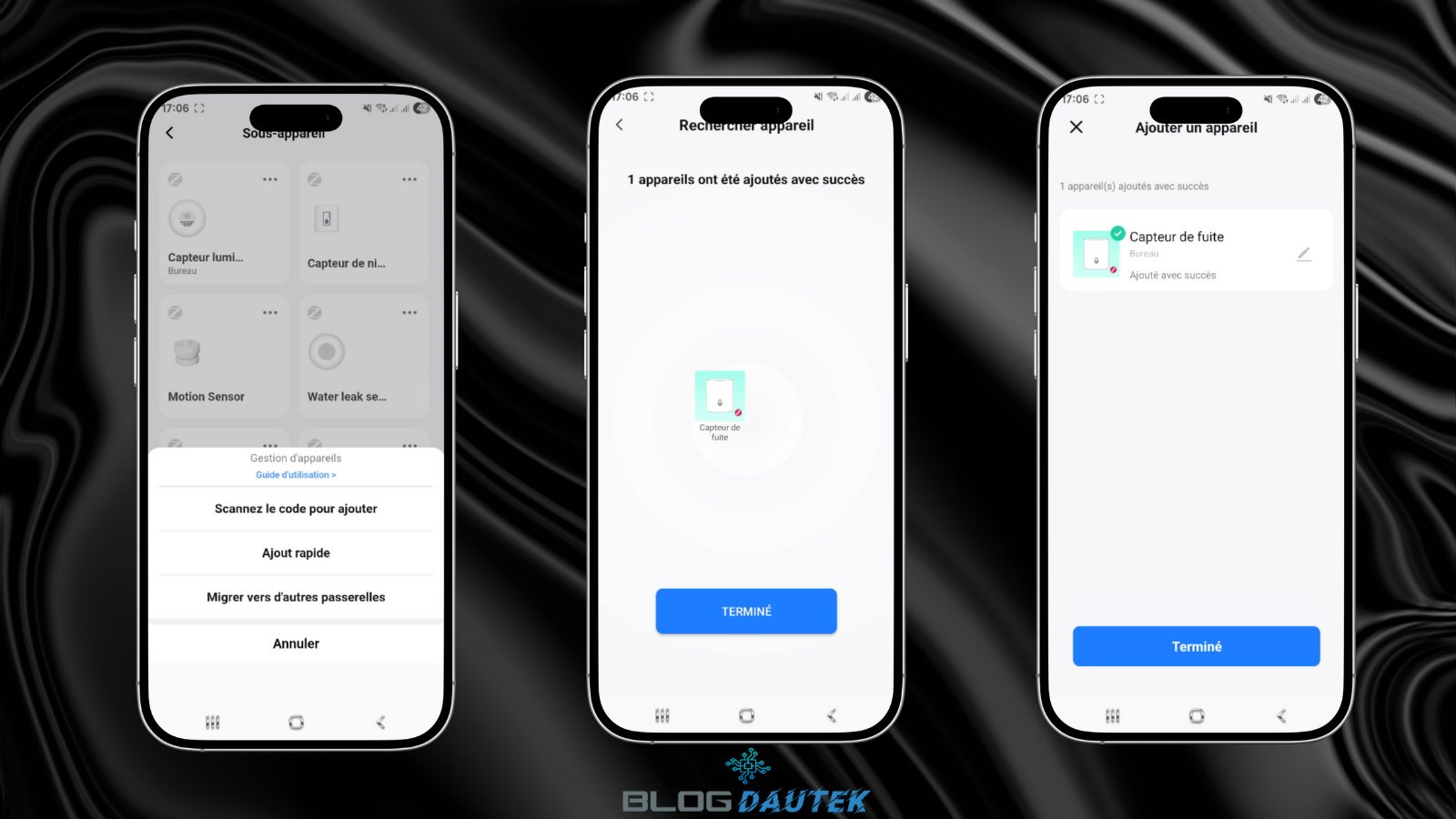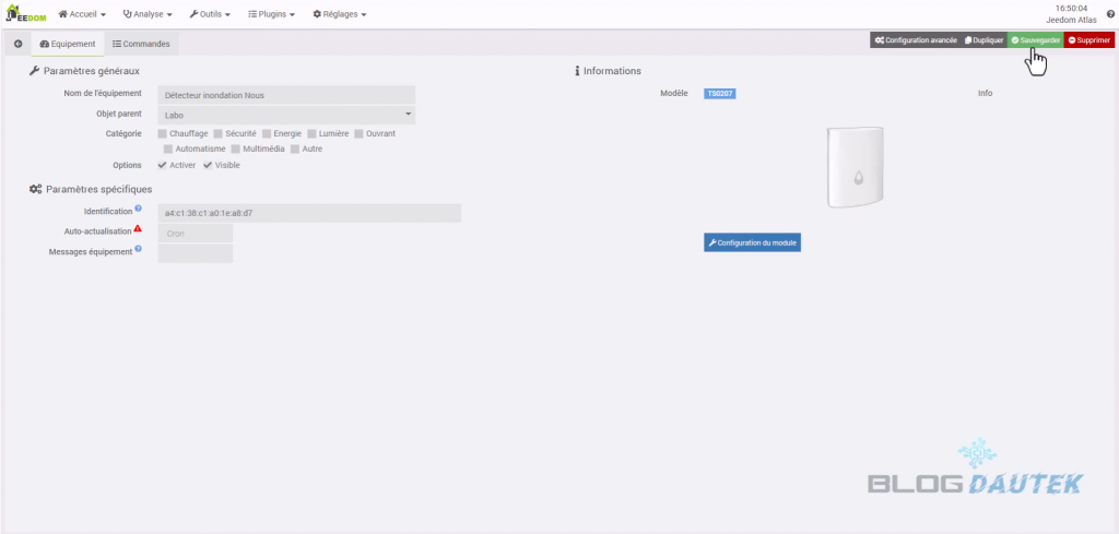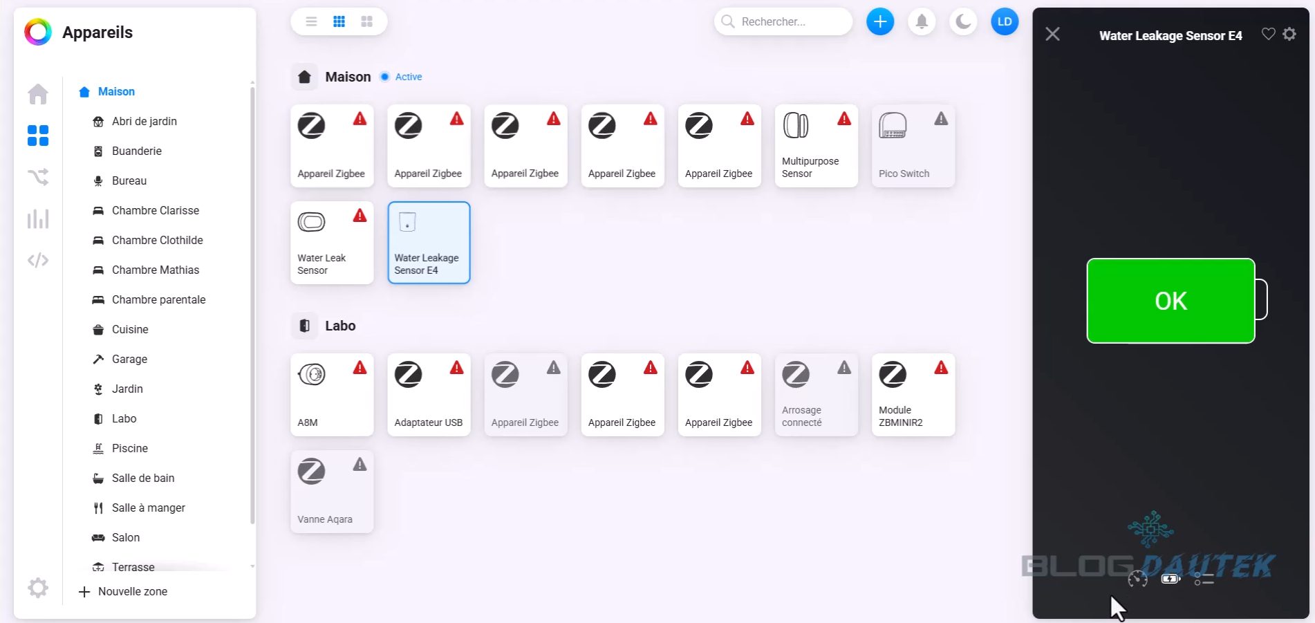Lancez l’appairage du détecteur d’inondation. Une fois trouvé, personnalisez son nom et attribuez-lui une pièce, puis sauvegardez.