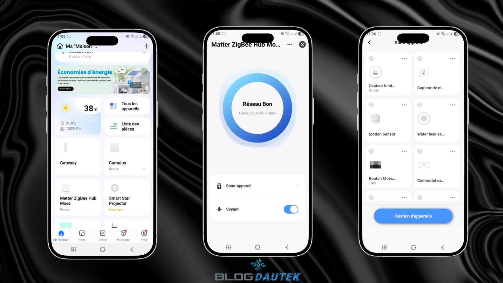 Pour configurer le détecteur d’inondation dans l’application, vous devez disposer d’un Hub Zigbee, dans mon cas la box Moes Matter et cliquez dessus puis Sous appareil puis Gestion d’appareil.