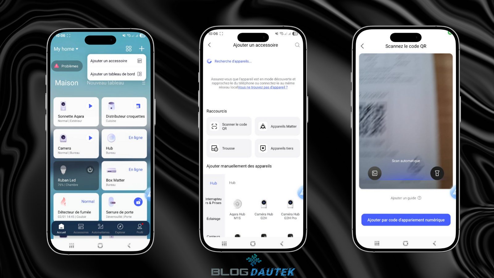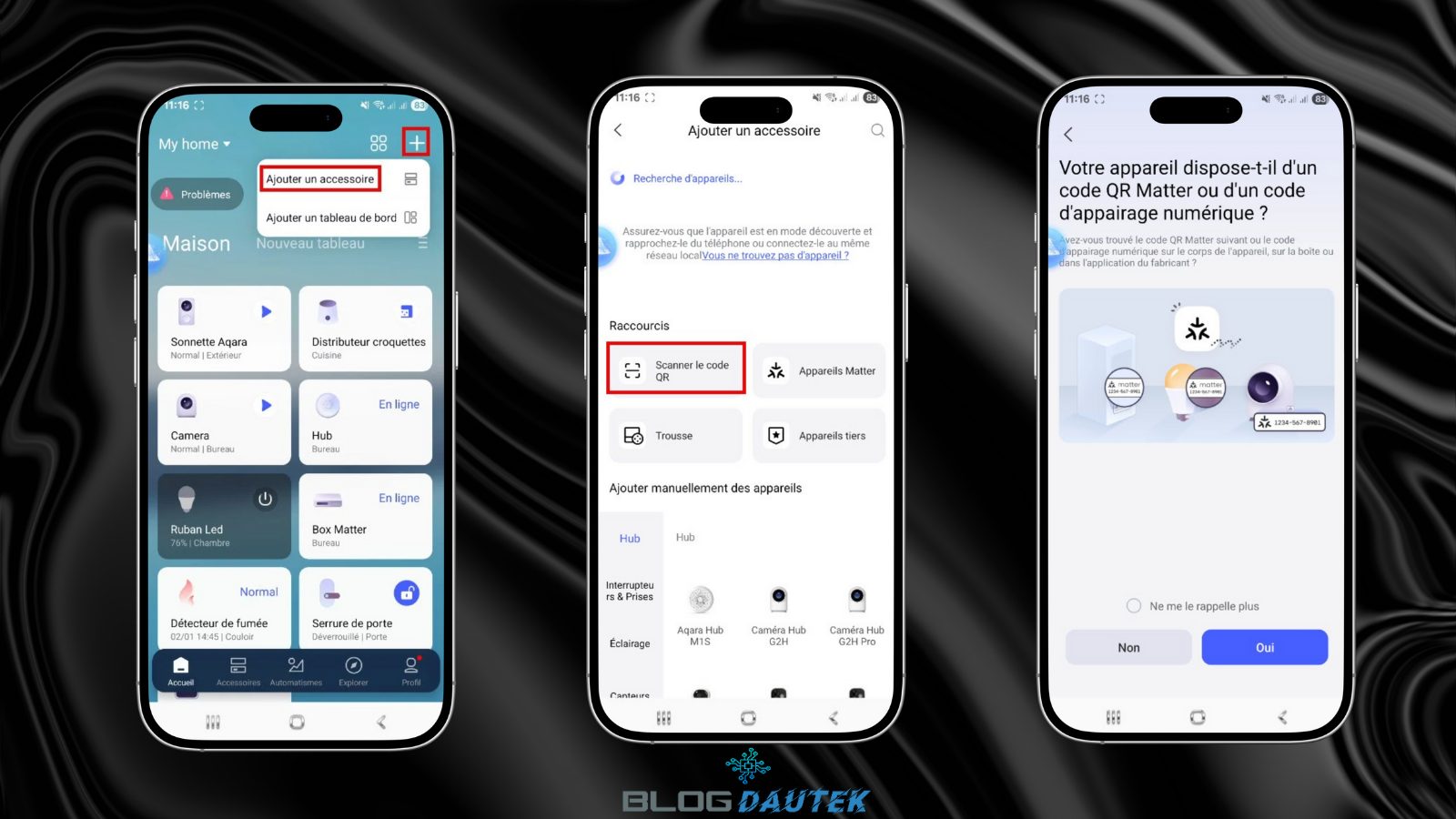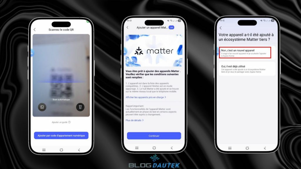 Comme pour Alexa, si vous n’avez pas l’application Aqara, il faudra la télécharger et l’installer ainsi que la création d’un compte. Ensuite, cliquez sur le + et sur Ajouter un accessoire et cliquez sur Scanner le QR code puis sur Oui.