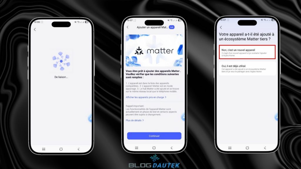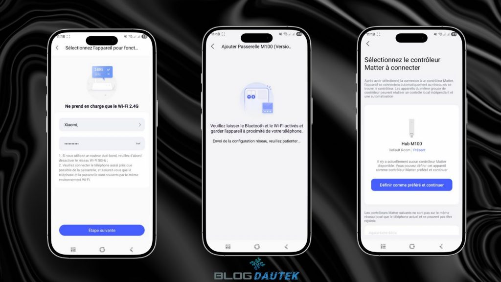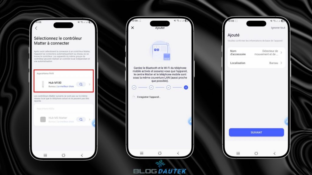 Petite différence par rapport au détecteur de mouvement, l’ampoule peut fonctionner sur deux protocoles Matter over Thread et Zigbee. Par défaut, l’ampoule est configurée avec Thread, d’où la case cochée sur Thread et comme le Hub M100 est aussi compatible Matter over Thread, on reste sur cette configuration. Sélectionnez le hub M100 et laisser l’intégration se faire.