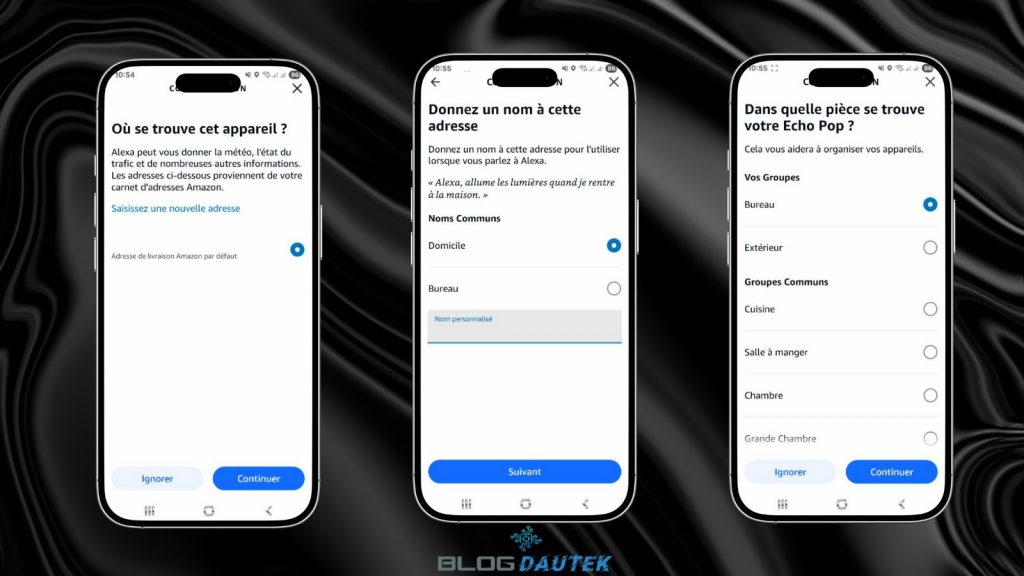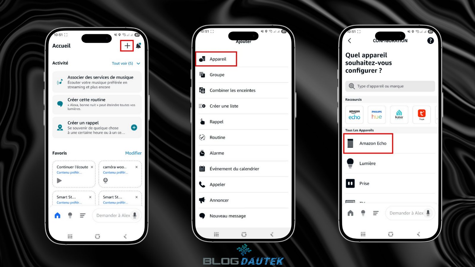 Pour l’intégrer il faudra télécharger et installer l’application Amazon Alexa et créez un compte. Ensuite, cliquez sur le + en haut à droite, puis, sur Appareil et Amazon Echo.