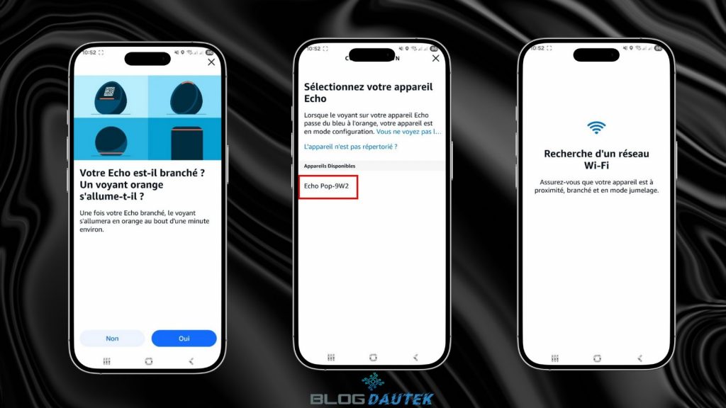 Branchez votre Echo Pop si ce n’est pas déjà fait et cliquez sur Oui. Sélectionnez votre Echo Pop et un réseau Wi-Fi va être cherché.