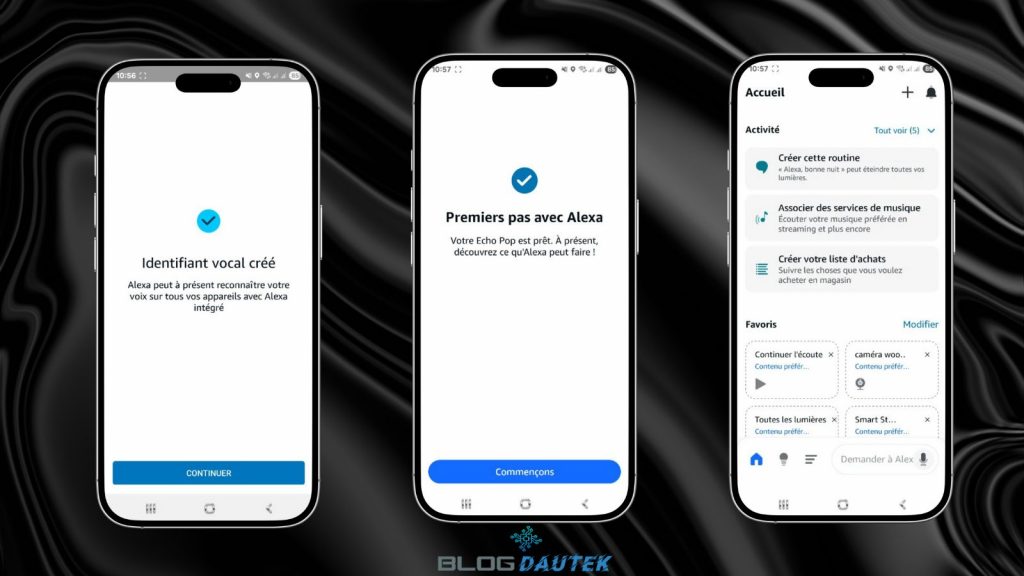 Enfin, la reconnaissance est terminée, cliquez sur Continuer, puis cliquez sur Commençons et vous arrivez sur la page d’accueil d’Alexa.