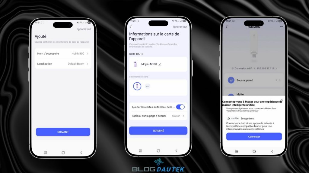 Maintenant, changer le nom si vous en avez envie ainsi que la pièce etcliquez sur Suivant. Sur la carte, faites la même chose et cliquez sur Terminé. Ensuite, on vous demande si vous souhaitez connecter à d’autres systèmes domotique, si c’est le cas cliquez sur Connecter, sinon cliquez sur la croix.