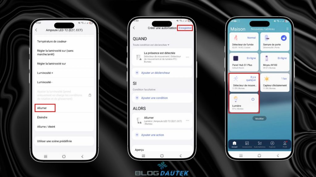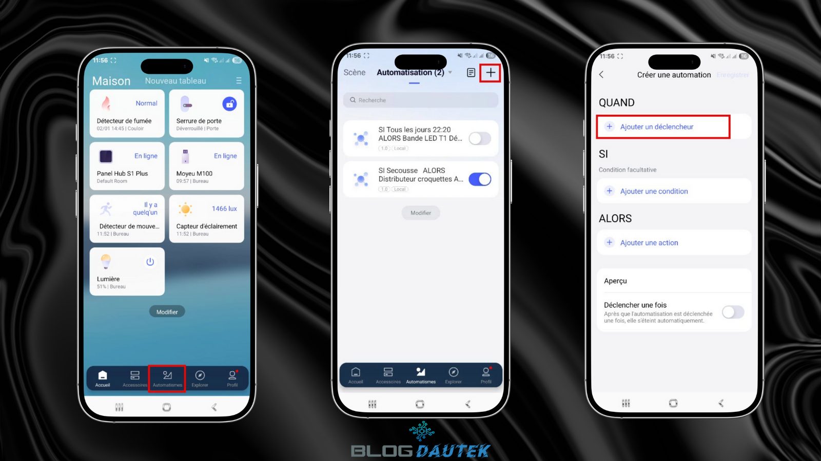 Pour finir ce test, je vais vous montrer un scénario de base que vous pouvez modifier à vos besoins. Je vais faire un scénario très simple, allumer l’ampoule quand il y a une détection de mouvement. Pour cela, allez sur Automatismes en bas puis sur le + en haut à droite et dans QUAND cliquez sur Ajouter un déclencheur.