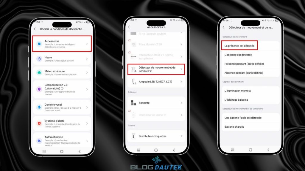 Cliquez sur Accessoires puis cliquez sur le détecteur de mouvement. Enfin, cliquez sur la présence est détectée.