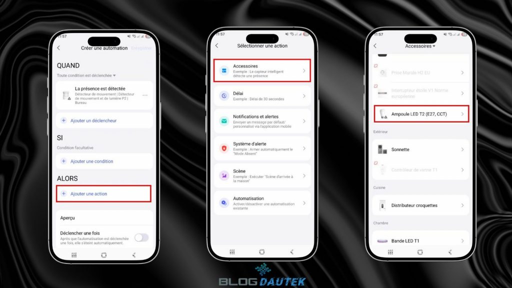 Maintenant, dans la partie ALORS, cliquez sur Ajouter une action puis sur Accessoires. Sélectionnez l’ampoule en cliquant dessus.