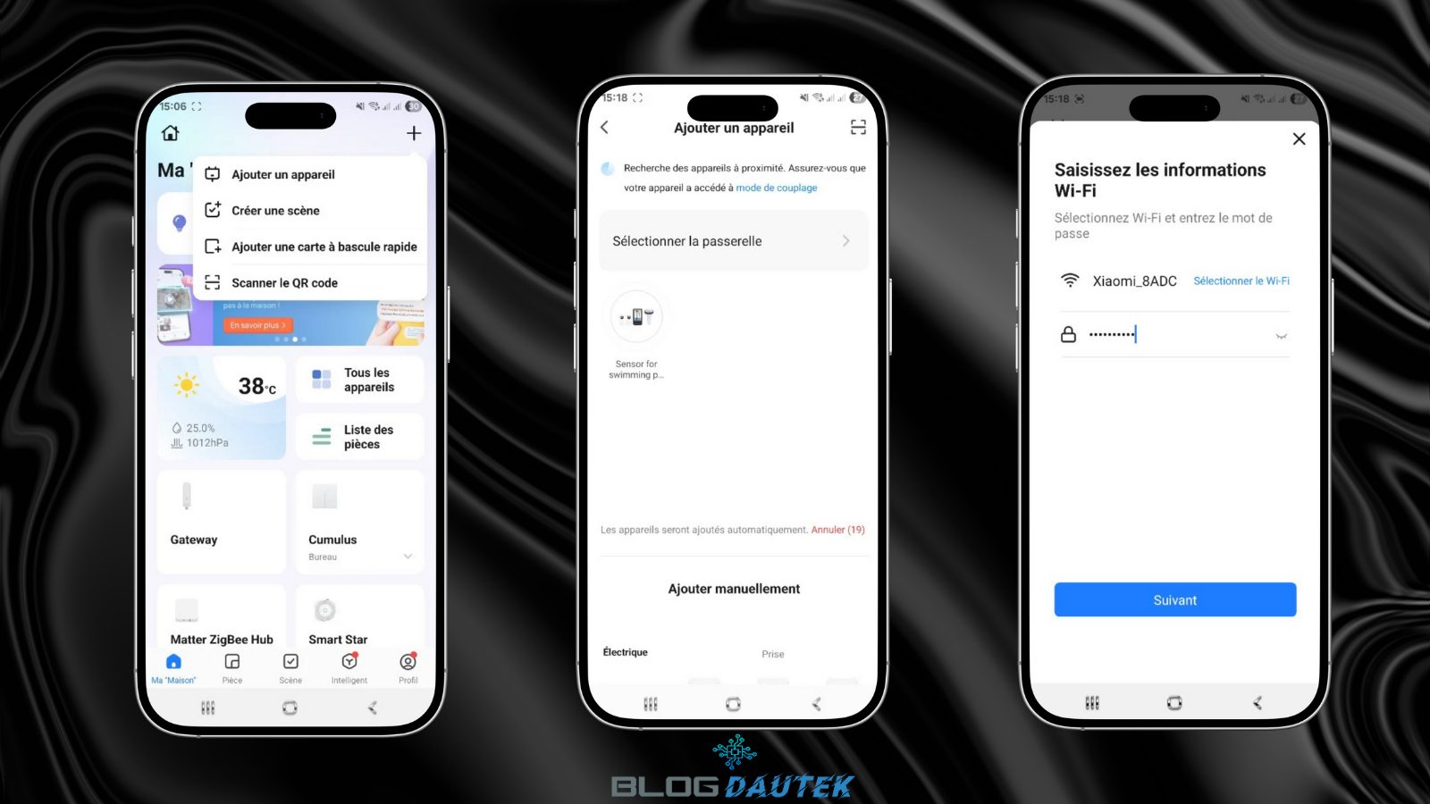 Vous pouvez faire l’intégration sur l’application Smartlife / Tuya, cliquez sur le + en haut à droite et cliquez sur Ajouter un nouvel appareil. Ensuite, la sonde de température est trouvée, cliquez dessus et choisissez votre réseau Wi-Fi puis cliquez sur Suivant.