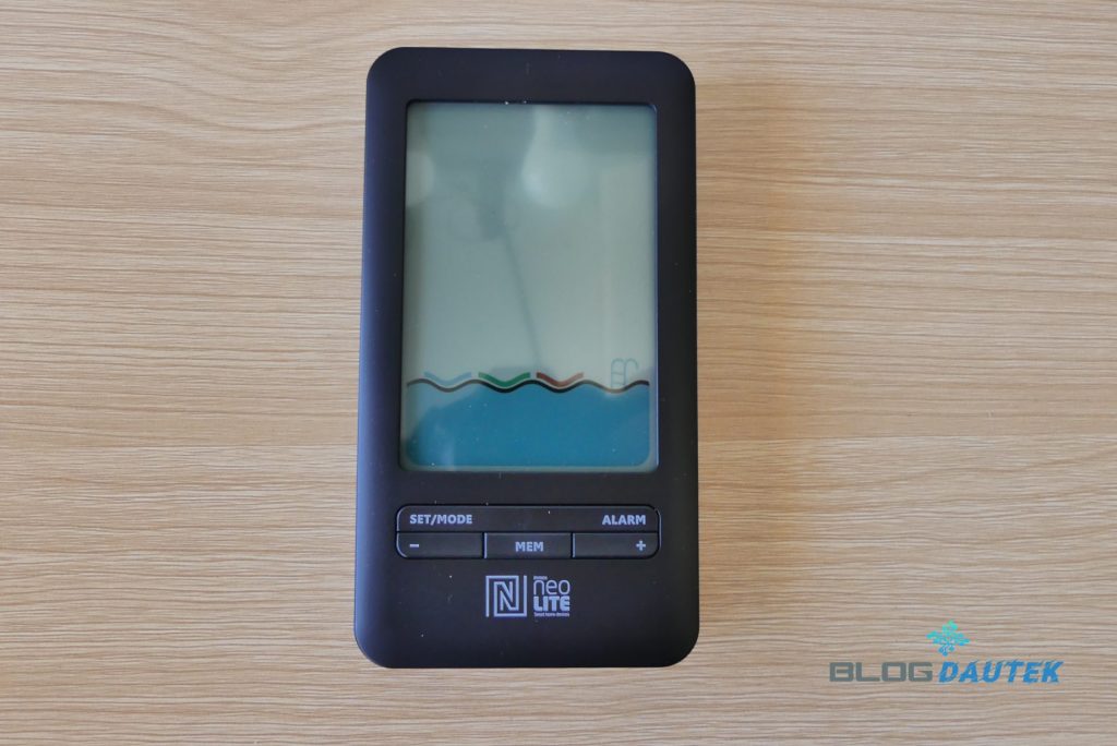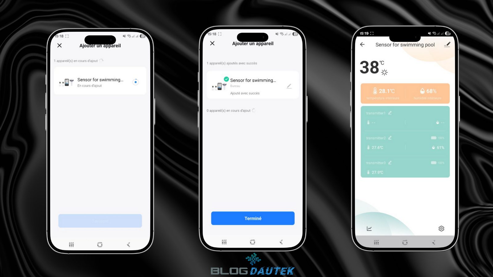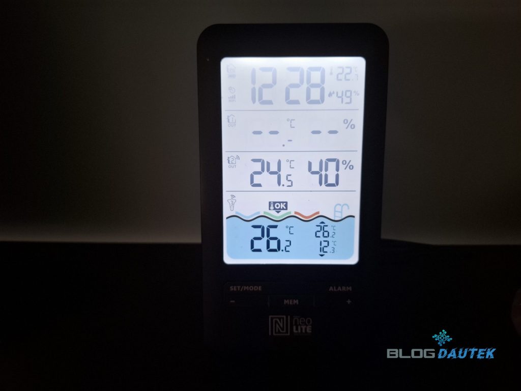 On voit sur le panneau, en haut, l’heure et la température et l’humidité dans la pièce où il est installé. Ensuite, on a les 2 capteurs intérieur et en bas la sonde de piscine, avec, à gauche la température actuelle et à droite la température la plus haute et la plus basse.