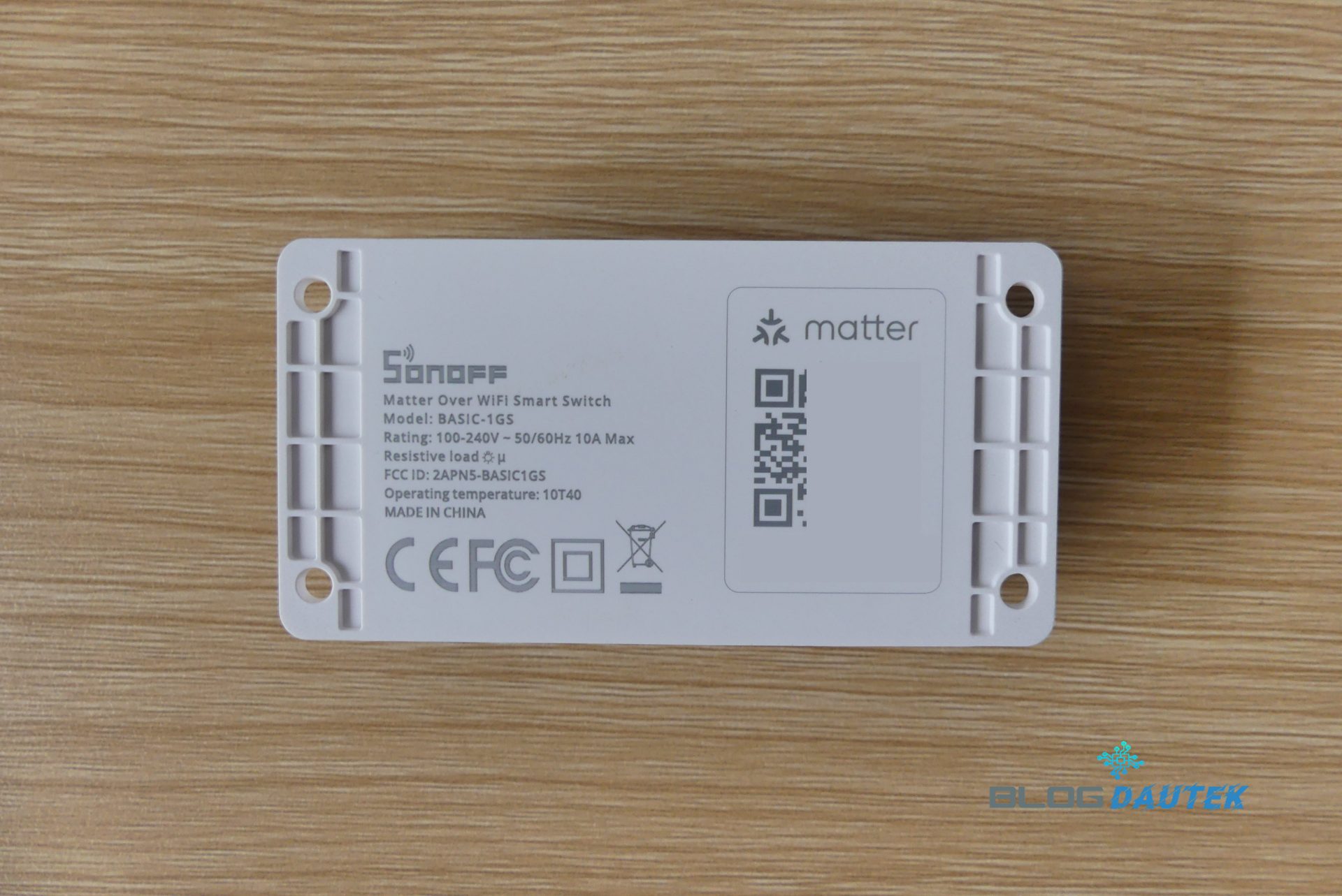 Vue de dessous, avec QR code pour l’intégration Matter et quelques caractéristiques