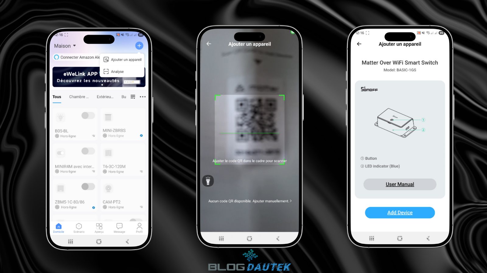 Pour configurer le module Sonoff Basic dans l’application, vous devez disposer d’un compte Ewelink. . Pour l’intégrer, cliquez sur le + en haut à droite puis, sur Analyse et scannez le QR code. Cliquez sur User Manuel pour accéder à la notice et sur Add Device pour commencer l’intégration.