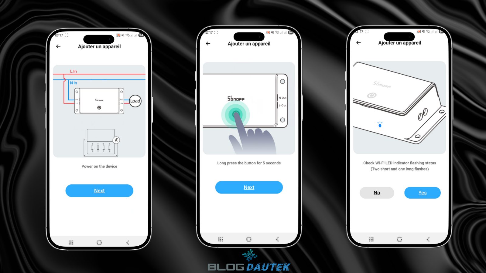 Ensuite, branchez le module et cliquez sur Next. Appuyez 5 secondes sur le bouton du bas et cliquez à nouveau sur Next. Puis, si la LED bleu clignote alors cliquez sur Yes.