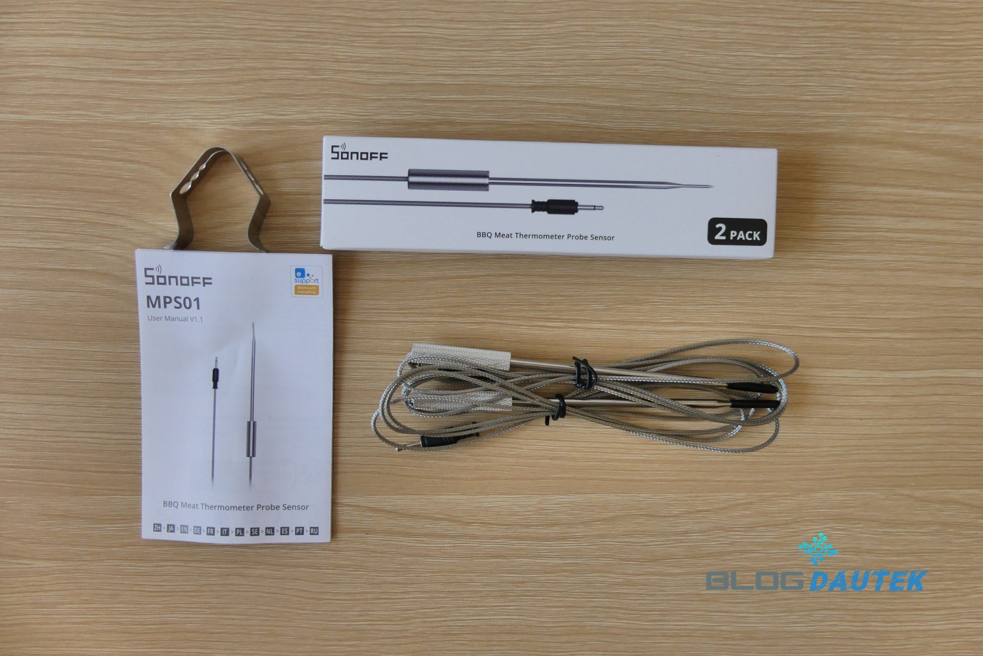 Le thermomètre est fourni avec une notice, un crochet aimanté pour le boitier, une patte pour mettre une sonde entre les grilles du barbecue, 2 sondes et un sac de rangement.