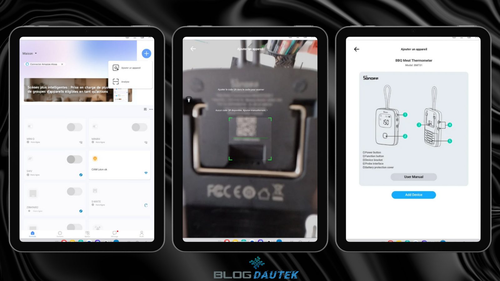 Ouvrez l’application Ewelink et cliquez sur Analyse et scannez le QR au dos du boitier. Ensuite, cliquez sur User Manual pour lire la notice ou sur Add Device pour intégrer le thermomètre.