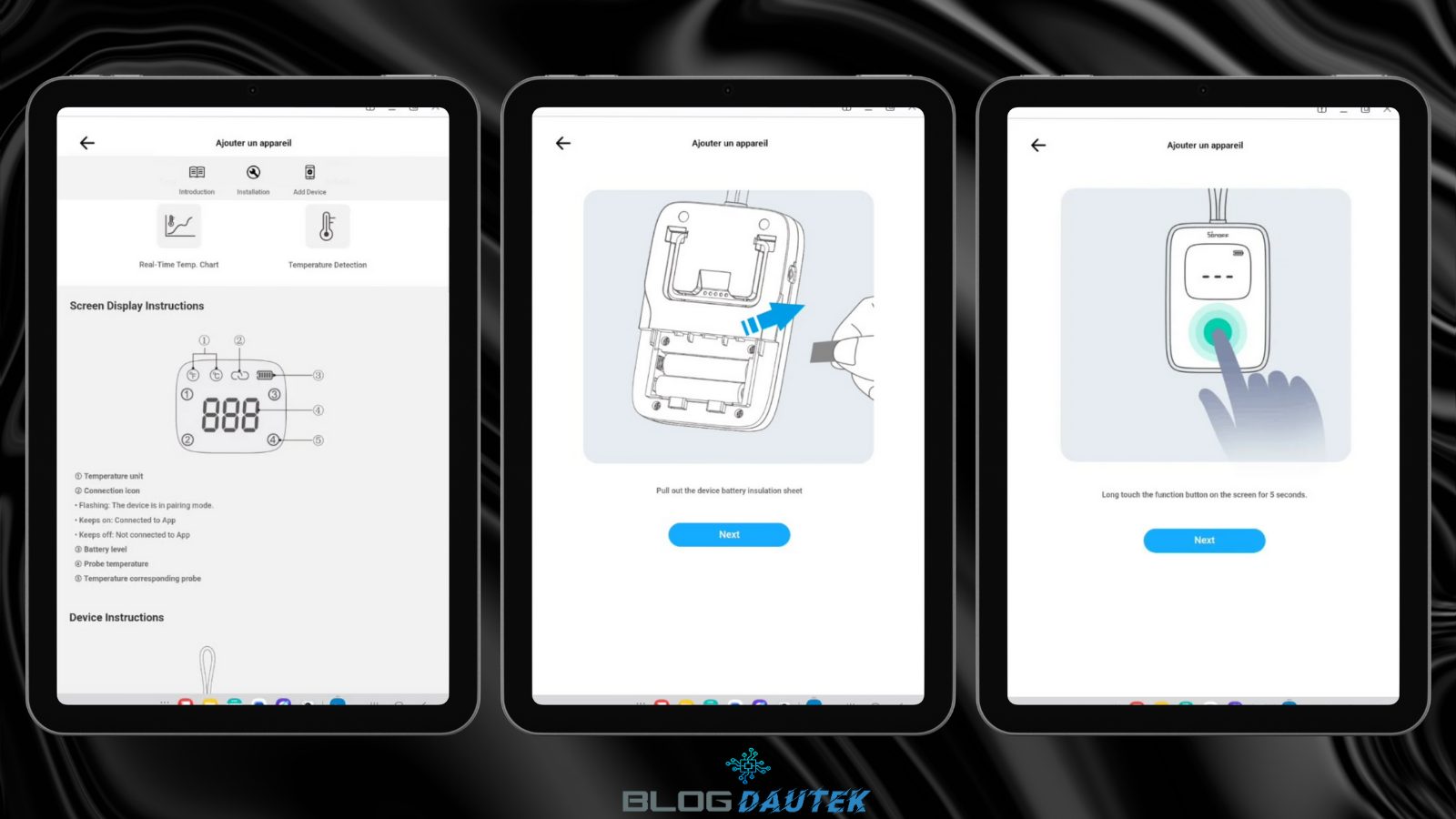 Ensuite, enlever la protection des piles et cliquez sur Next. Maintenant, lancez l’appairage en appuyant 5 secondes sur le bouton.