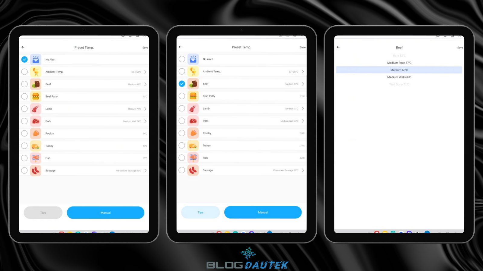 Mais le mieux est de cliquer sur Preset temp, pour sélectionner la viande ou le poisson et choisir la température en fonction de la cuisson de sa viande, puis cliquez sur Save pour enregistrer. Comme cela, vous aurez une alarme quand la viande sera cuite à votre goût!